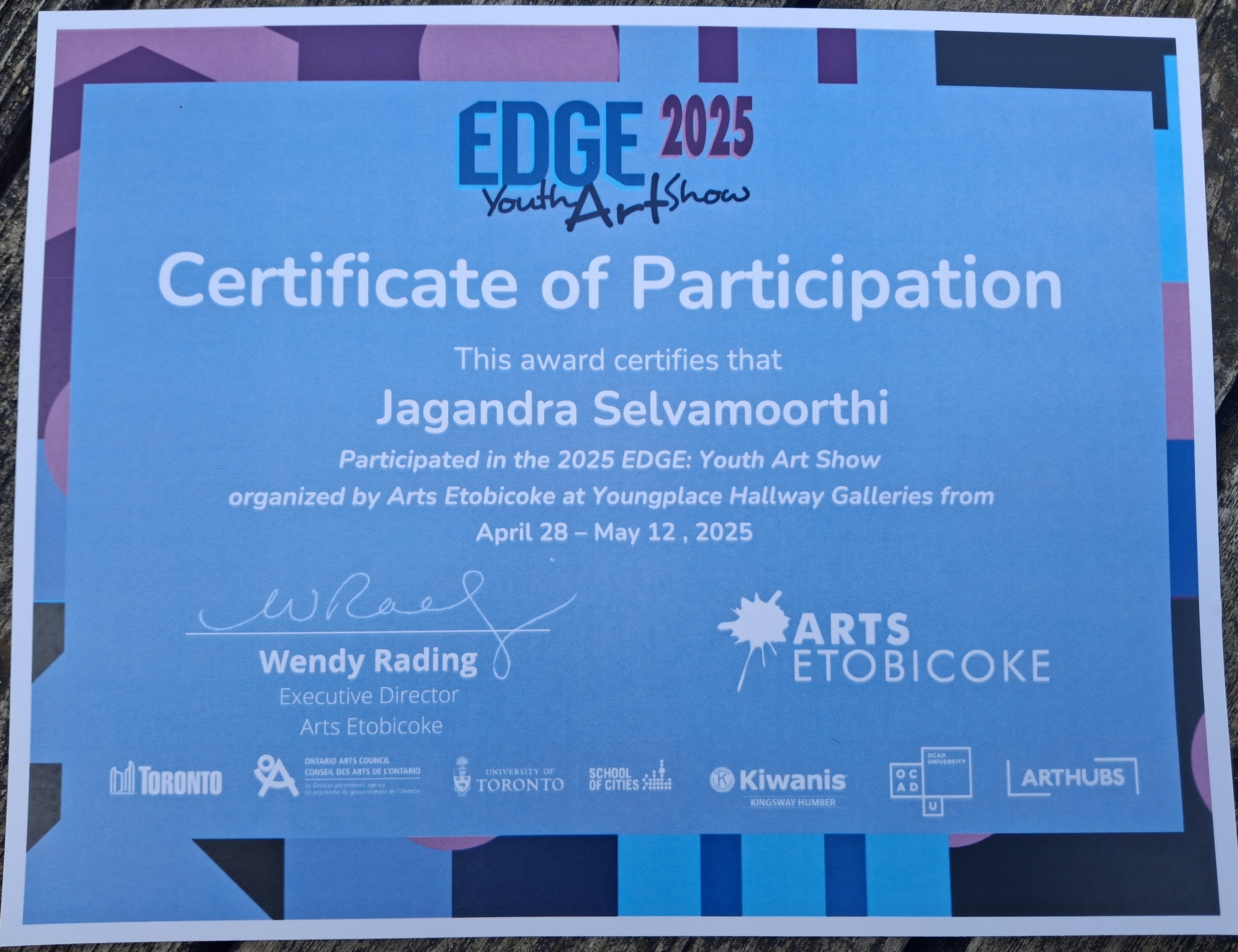 Certificate awarded for my participation in the Edge Youth Art Program.